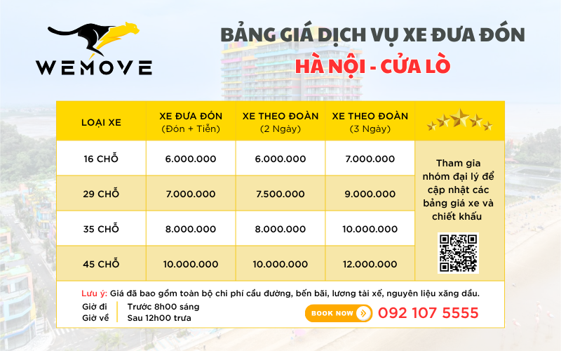 | 10 | Hà Nội – Cửa Lò | Tiễn + Đón | 16 Chỗ | 7.000.000 | 8.000.000 |